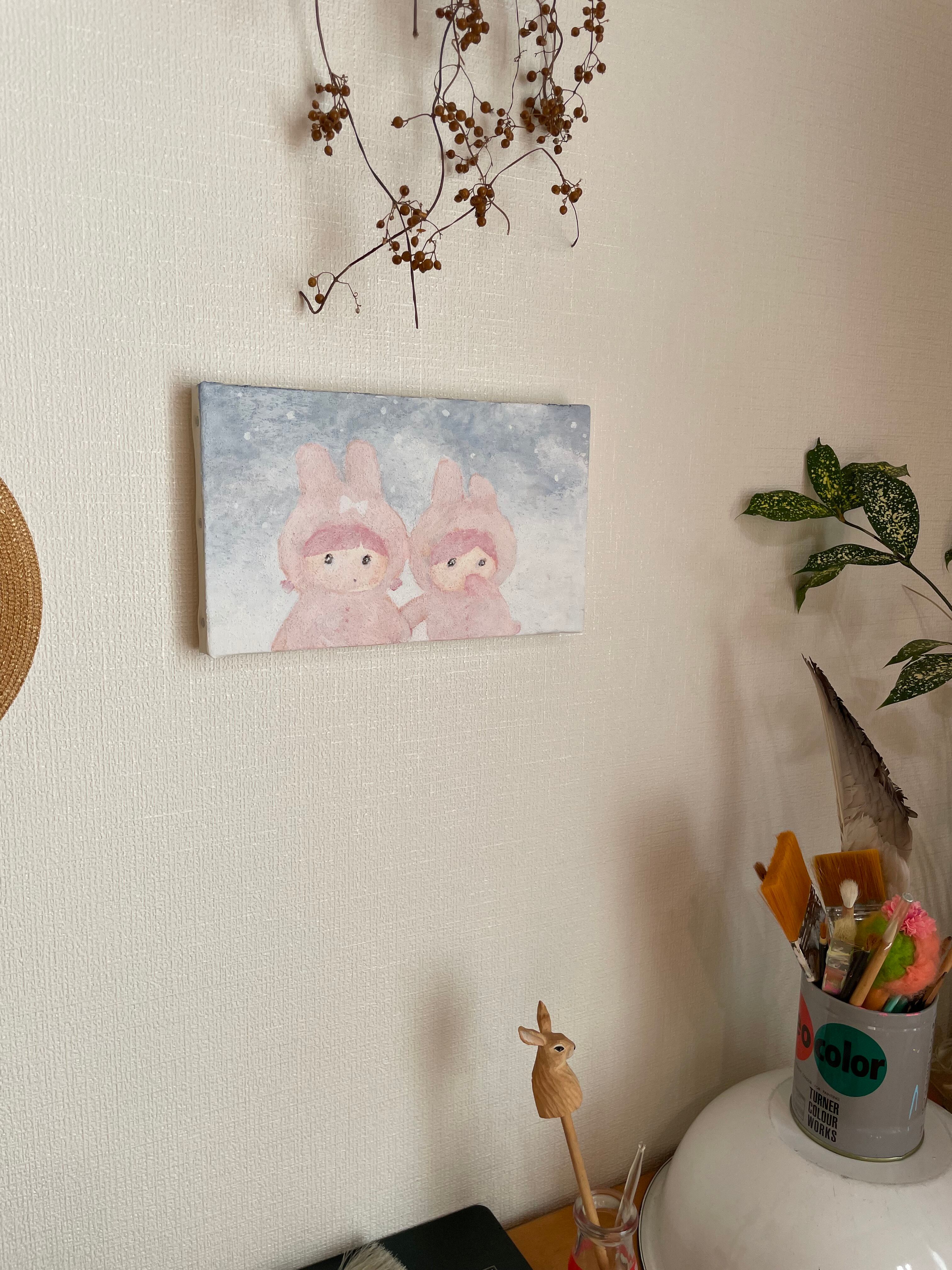 ジェッソがもたらす粒子の素材感が絵に表情を与えています。場所と時が作る色彩は美しく小さいながらも存在感のある絵画です。
