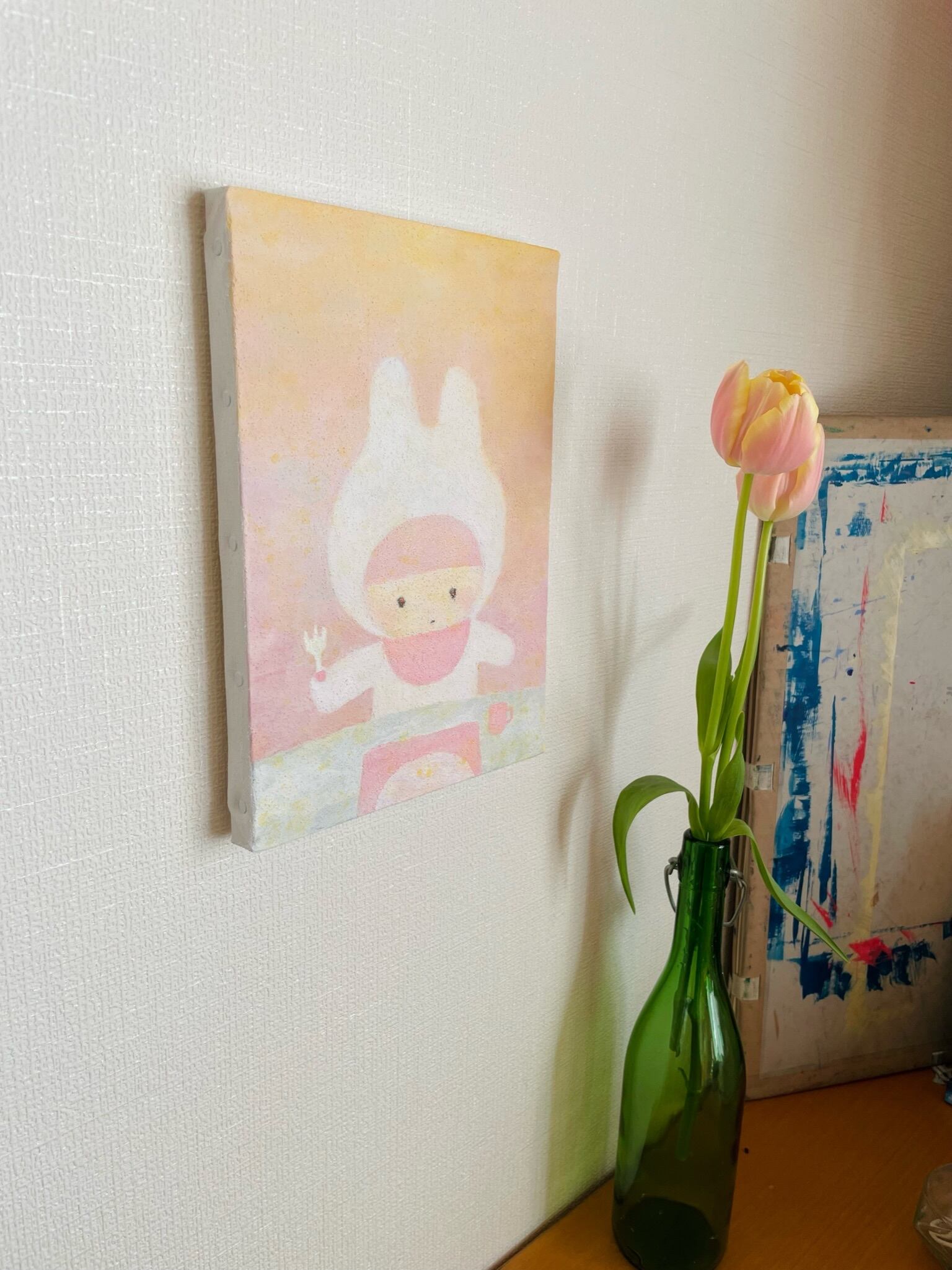 ジェッソがもたらす粒子の素材感が絵に表情を与えています。場所と時が作る色彩は美しく小さいながらも存在感のある絵画です。